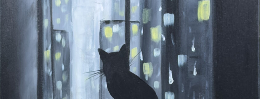 With layered grays, soft highlights, and expressive brushwork, this painting feels calm, introspective, and cinematic β perfect for night owls, cat lovers, and anyone who appreciates art with mood and meaning.