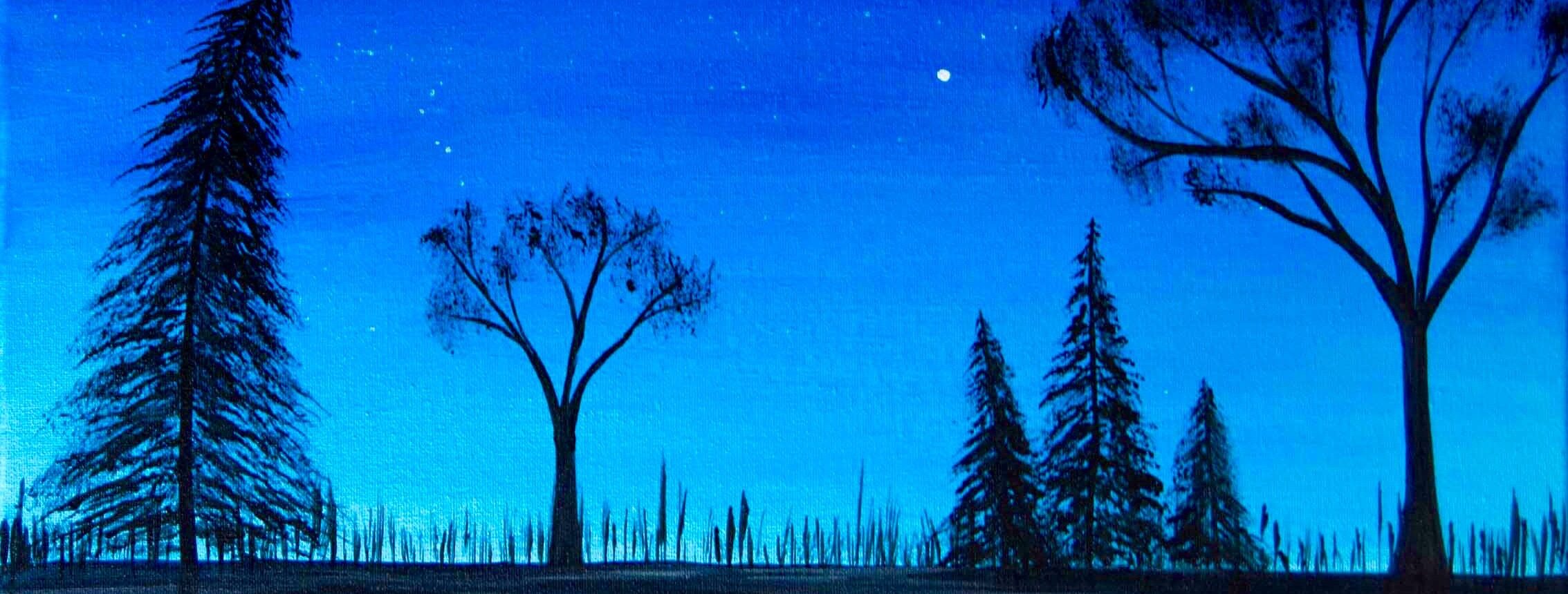 Guided step-by-step by our talented local artist Emily, you’ll create a peaceful forest silhouette beneath a starlit sky. Perfect for beginners and seasoned painters alike, this piece uses simple brush techniques and a rich blue palette to evoke calm and wonder.
