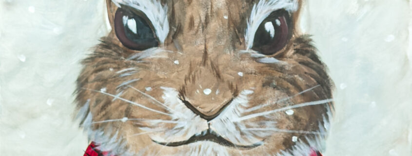 Join us at the Wine & Canvas Studio for Snow Bunny, an adorable Paint & Sip Party featuring a sweet winter rabbit bundled up in a red plaid scarf as soft snow falls around it.