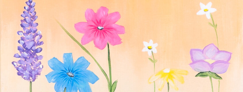 Join us at the Wine & Canvas Studio for Wildflower Beginnings, a joyful Paint & Sip Party inspired by the beauty of spring meadows in bloom. This uplifting design features tall, whimsical wildflowers in bright, happy colors set against a warm pastel sky — light, airy, and full of optimism.