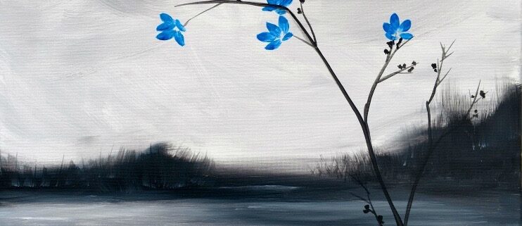 Join us at the Wine & Canvas Studio for Winter Flowers, a serene Paint & Sip Party inspired by the beauty of resilience in winter. This calming design features delicate blue blossoms reaching from bare branches over a quiet, icy landscape beneath a soft gray sky.