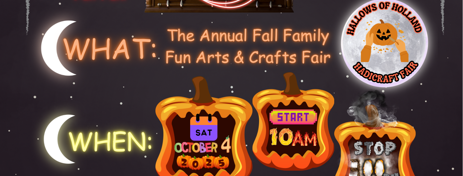 Come join us at our fourth annual family, friendly arts and craft show. Saturday October 4th 10am-3pm Club 16 Ballfields 316 S. King Rd Holland Ohio Free admission Trick Vendors Food trucks Free pumpkins Trick Trick or treat at each vendor booth Kids games and much more!